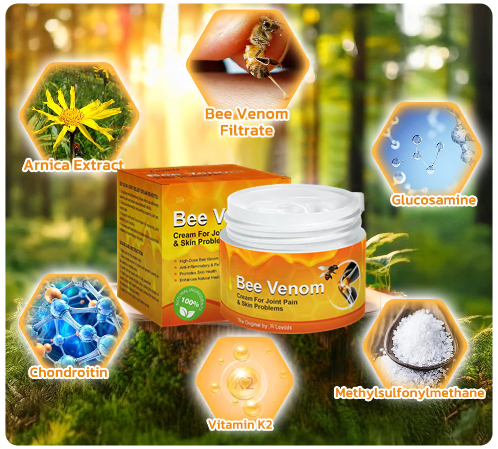 ⢠Bee venom also contains enzymes, amino acids, sugars, lipids, and vitamins, which contribute to joint tissue repair, improving elasticity and mobility.