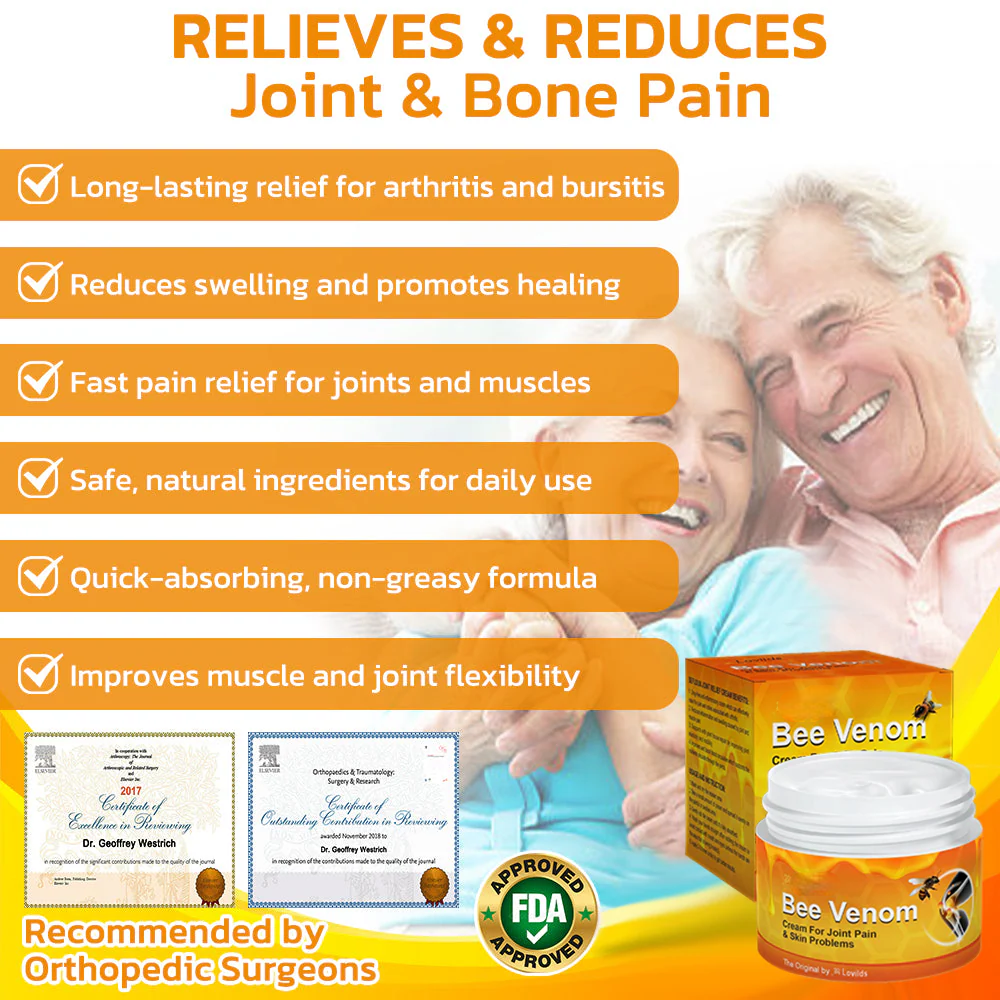 Approved by an orthopedic surgeon, Bee Venom Pain Suppression Joint Healing Cream is designed to effectively treat orthopedic conditions and alleviate arthritic pain within 3-6 weeks.