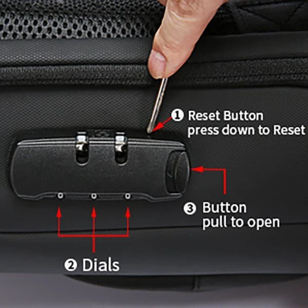 Open the lock (default code: 0-0-0) and release the zipper heads.